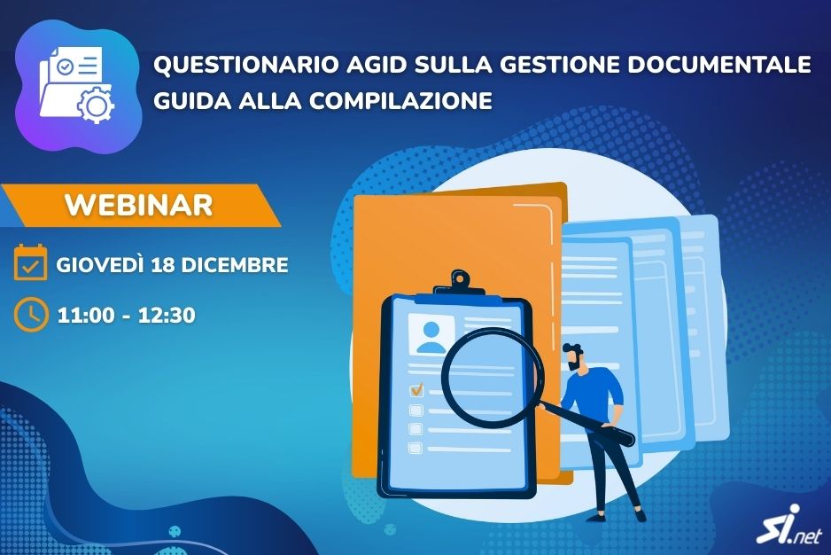 Giovedì 18 dicembre dalle 11:00 alle 12:30 si terrà il webinar gratuito incentrato sulla corretta interpretazione e compilazione del Questionario di valutazione AgID sulla formazione, gestione e conservazione dei documenti informatici.